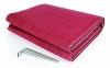 Cleans easily with soap and water. Made of durable, mildew resistant materials. Features rust resistant grommets and includes ground stakes. Woven design allows snow and rain to drain through mat. Helps keep dirt from being tracked into your RV. Also useful for picnics and beach outings.