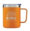 Travel mug is vacuum sealed and features double wall stainless steel. Holds 12 ounces of liquid. Includes a lid. Powder coated. Orange.